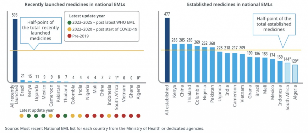 这在一定程度上可以用NEML的机制来解释。WHO EML每两年更新一次,而NEML的更新则不那么频繁。在所分析的LICMs中,有一半的国家自新冠疫情以来未曾更新过NEML,仅有四个国家的NEML更新时间晚于2023年版的WHO EML。