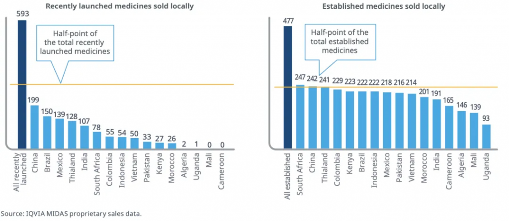另四个国家——马里、喀麦隆、阿尔及利亚和乌干达,几乎没有新上市的药品在销售,或仅销售一种。值得注意的是,马里和乌干达是样本中仅有的低收入国家,而喀麦隆是接近低收入国家门槛的中低收入国家。