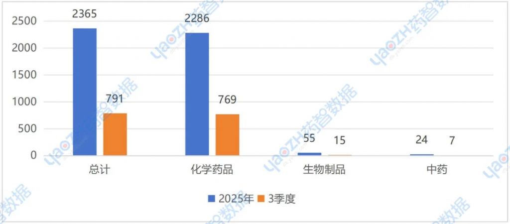 据药智网《中国上市药品数据库》统计,至2025年9月30日,2025年国家药监局批准了2366个品种(药品+企业)上市,包括2286个化药、56个生物制品和24个中药,共2944个批文。3季度,新增968个批文,共791个品种,包括769个化药、15个生物制品和7个中药品种。