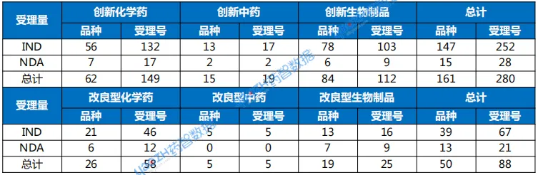 以注册分类统计,1类创新药受理161个品种。IND申请147个品种,NDA申请15个品种。2类改良型新药注册申请受理50个品种,化药申请26个品种,中药申请5个品种,生物制品申请19个品种。
