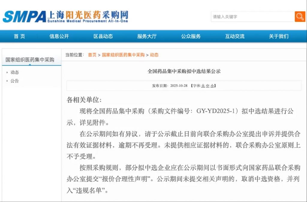 摘要:2025 年 10 月 30 日,第十一批国家组织药品集中采购(采购文件编号:GY-YD2025-1)拟中选结果正式公布,本次集采共有445 家企业的 794 个产品参与投标,最终272 家企业的 453 个产品获得拟中选资格,企业中选率达61% 、产品中选率达57% ;拟中选结果公示期至 2025 年 10 月 31 日,部分拟中选企业需在公示期提交 “报价合理性声明”,未提交者将取消中选资格并列入 “违规名单”。本次集采纳入55 种药品,覆盖抗感染、抗过敏、抗肿瘤、降血糖等多个治疗领域,预计全国患者于2026 年 2 月用上质优价宜的中选药;集采全程坚持 “稳临床、保质量、反内卷、防围标” 原则,通过多项措施控制竞争风险,且截至目前国家医保局已开展十一批集采,累计成功采购490 种药品。