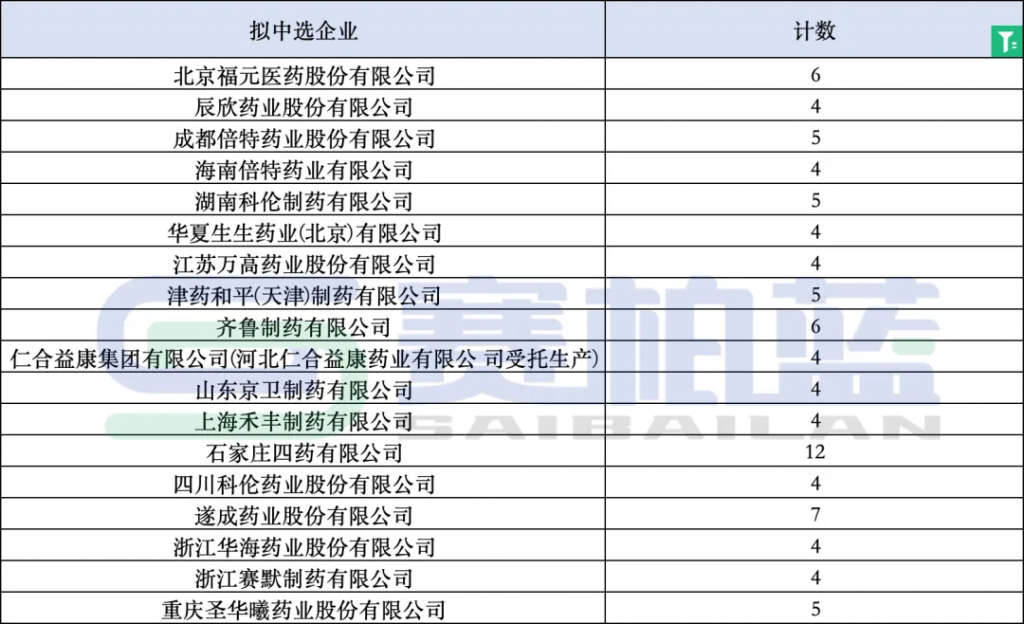 据赛柏蓝不完全梳理,此次拟中选企业中,石家庄四药、遂成药业、北京福元医药、成都倍特药业、海南倍特药业、湖南科伦制药、齐鲁制药等企业均有4家及以上产品拟中选。
